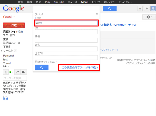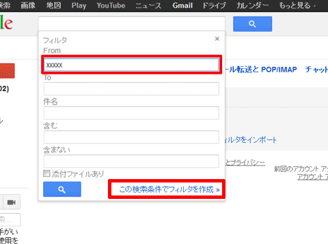 4.【From】の項目に当サイトのドメイン;shingan.netを入力し、検索ウィンドウの下部にある【この検索条件でフィルタを作成】をクリック。