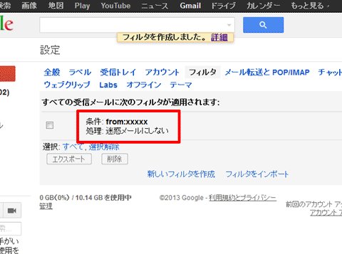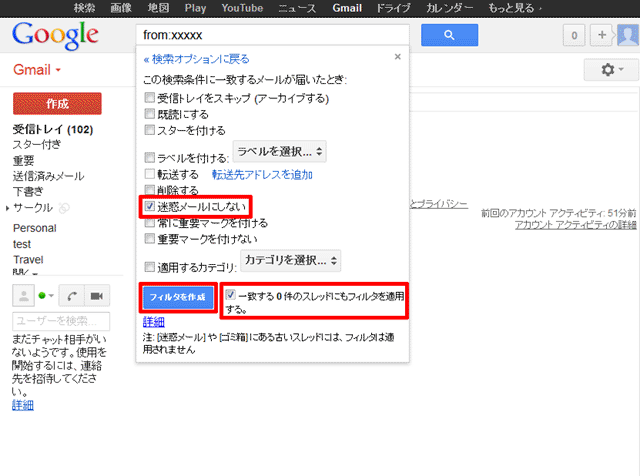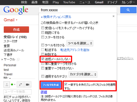 5.【迷惑メールにしない】と【一致する〇件のスレッドにもフィルタを適用する。】にチェックを入れ、【フィルタを作成】をクリック。