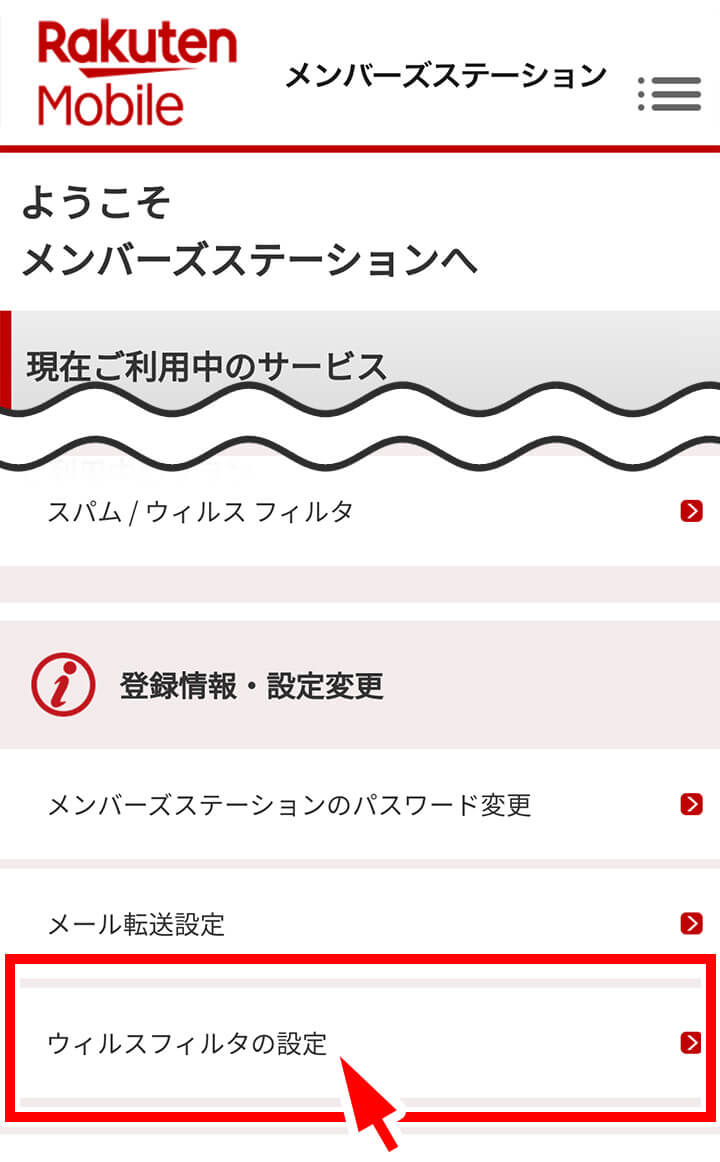 2.会員メニューの中から「ウイルスフィルタの設定」をクリックします。
